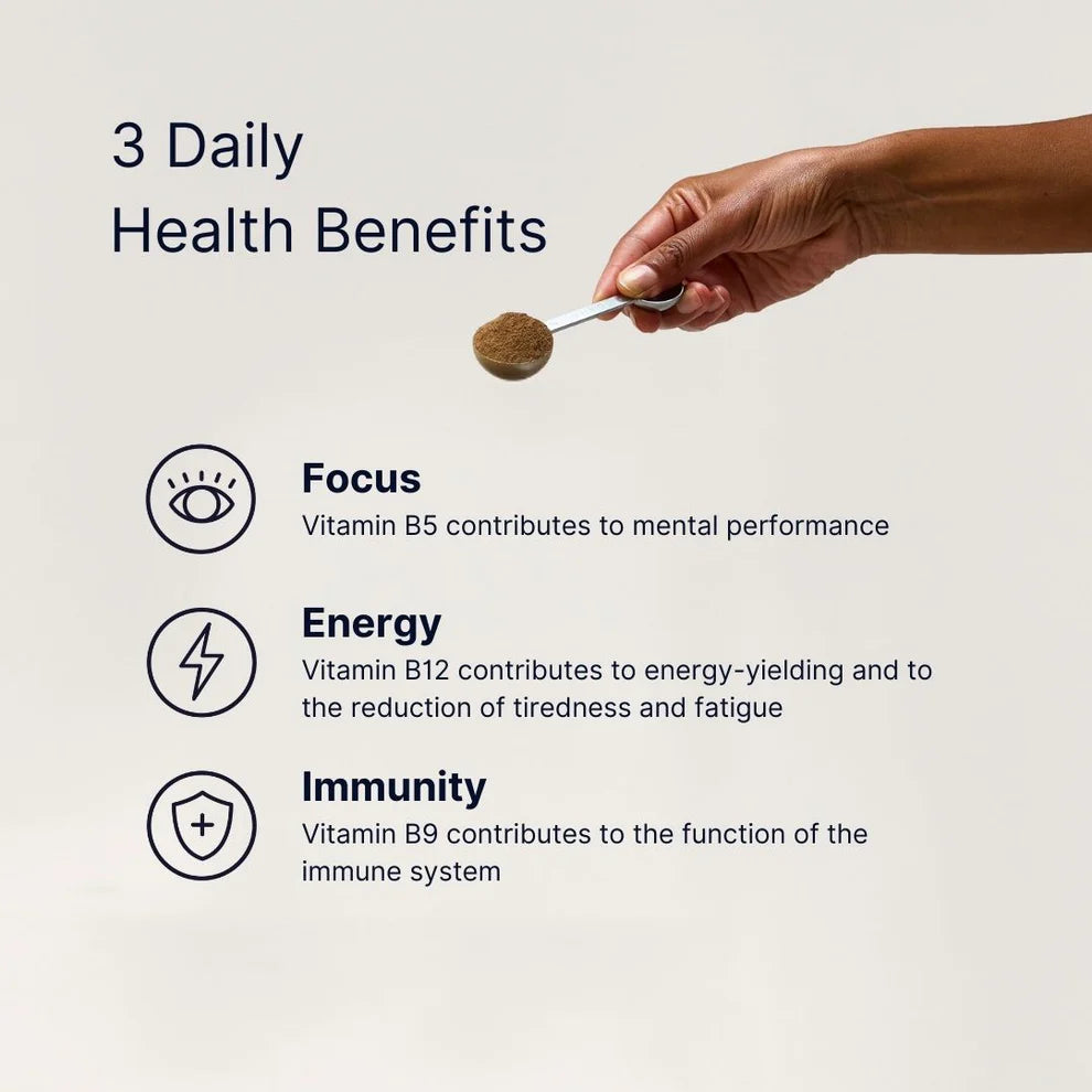 Our Mushroom Coffee contains Lion’s Mane and B vitamins (B5, B6, Folate and B12) which work together to support mental clarity, nervous system health, and energy metabolism, delivering a revitalising experience that promotes overall well-being.
