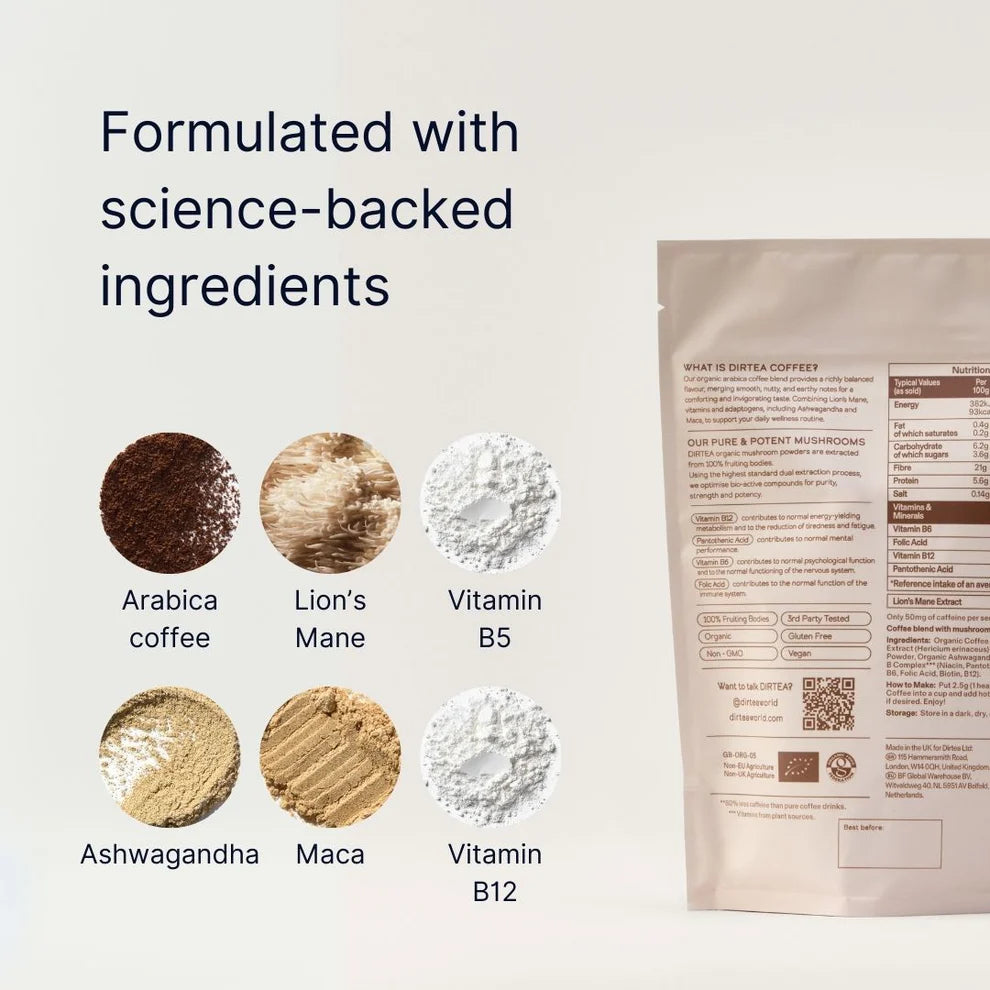 DIRTEA Mushroom Coffee blends the rich, smooth flavour of premium 100% arabica beans with Lion’s Mane mushroom extract and an organic B vitamin complex to enhance the mind and body. With the alertness-boosting antioxidants of coffee, up to 80% less caffeine, and sustained energy without crashes, it’s a smoother coffee alternative.