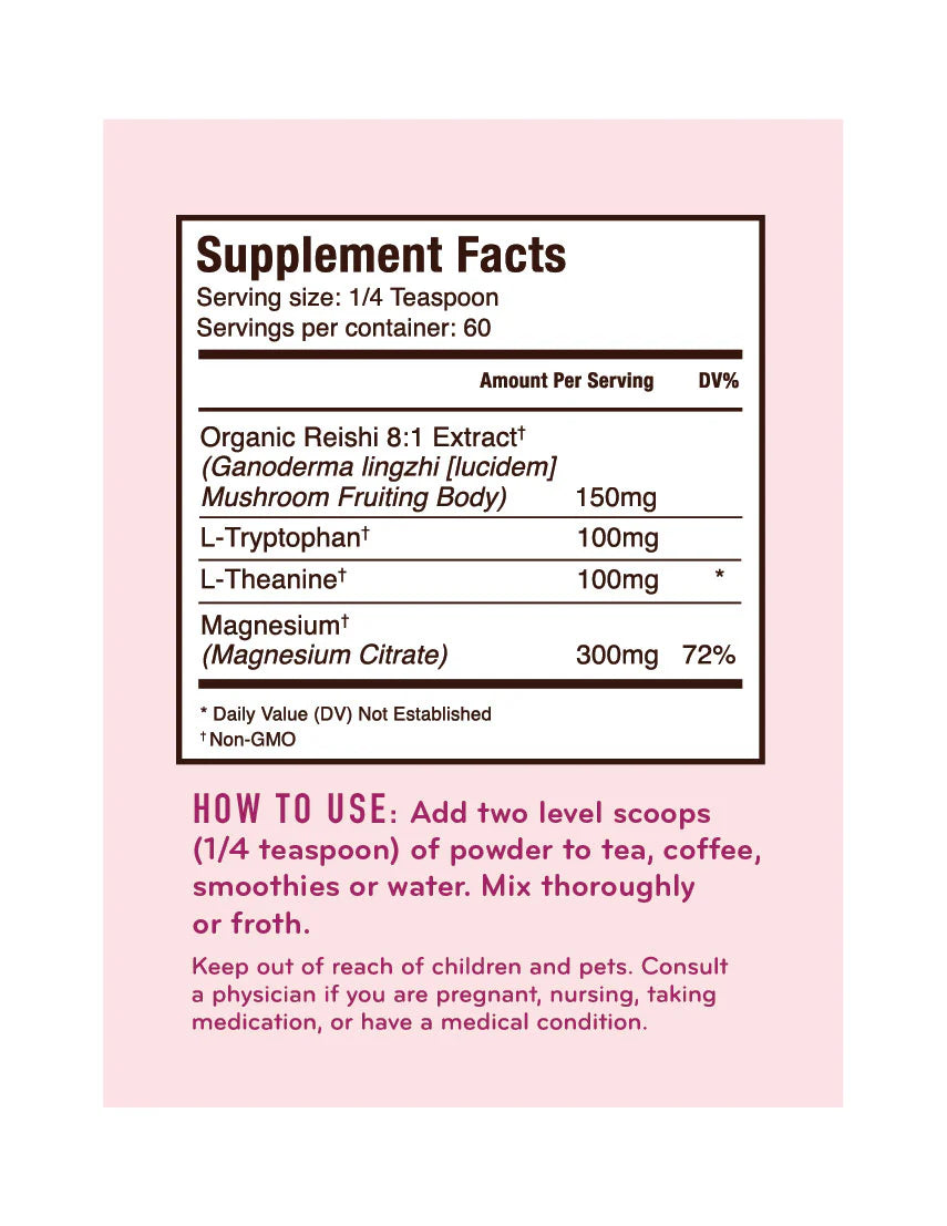 Slow down, soothe your brain and redefine your waking life with the foundation of magically good sleep. This powerful relaxation formula of Reishi mushrooms, L-Trytophan, L-Theanine and Magnesium will support you in your quest for rest and restorative slumber. *