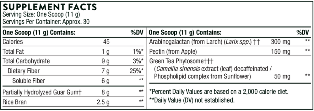 It mixes easily in water or a preferred beverage. FiberMend is a prebiotic fiber formula, which means it stimulates the growth of beneficial bacteria in the GI tract.* It combines Sunfiber® – a partially hydrolyzed guar gum fiber – with rice bran, larch arabinogalactan, apple pectin, prune powder, and green tea phytosome in a water-soluble blend that helps maintain healthy glycemic control (i.e., healthy blood sugar levels already in the normal range) and supports regularity and optimum digestive function.* FiberMend is well-tolerated – it produces little to no bloating, cramping or gas. And because it's tasteless, odorless, and dissolves readily in water, it can be easily mixed with a morning smoothie or any preferred beverage. • GI Support* • Liver/Detox*