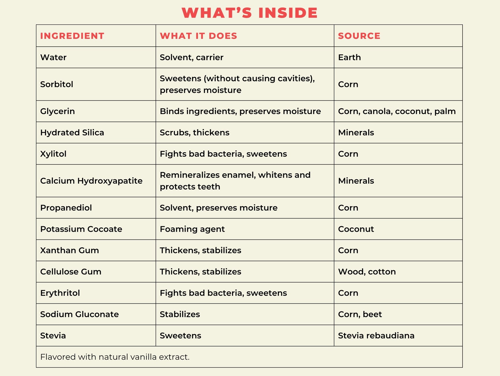 Formulated with 10% micro-hydroxyapatite, it naturally restores and whitens enamel, reducing sensitivity over time. With natural vanilla extract, this toothpaste delivers a fun, dessert-inspired flavor that both kids and adults love. Xylitol and calcium carbonate help fight cavities and gently scrub, while erythritol and stevia ensure a sweet, sugar-free experience.