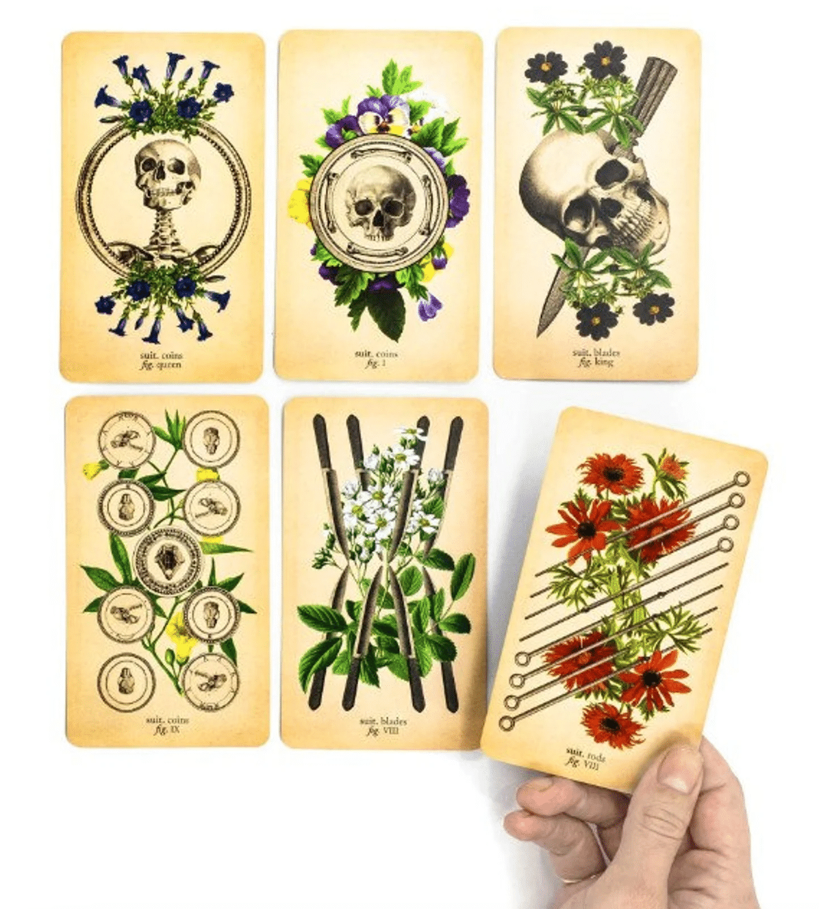 The cards, which feature illustrations of vintage anatomical drawings collaged with plants and flowers, represent a fresh and creative interpretation of the tarot archetypes. Special features include: