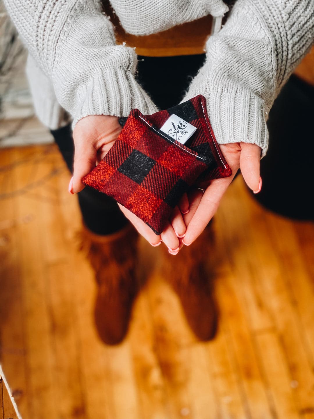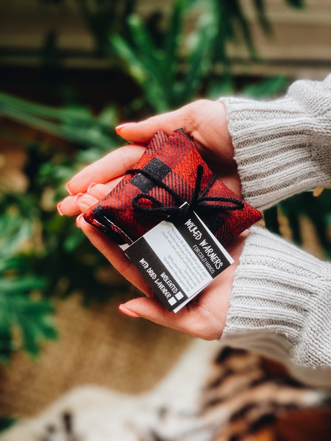 Microwave 30-40 seconds with a cup of water & feel the heat in your hands for up to an hour. Handle with care. Product will (obviously) be hot. Spot clean only. They can also be stored in the freezer and used as cooling packs!